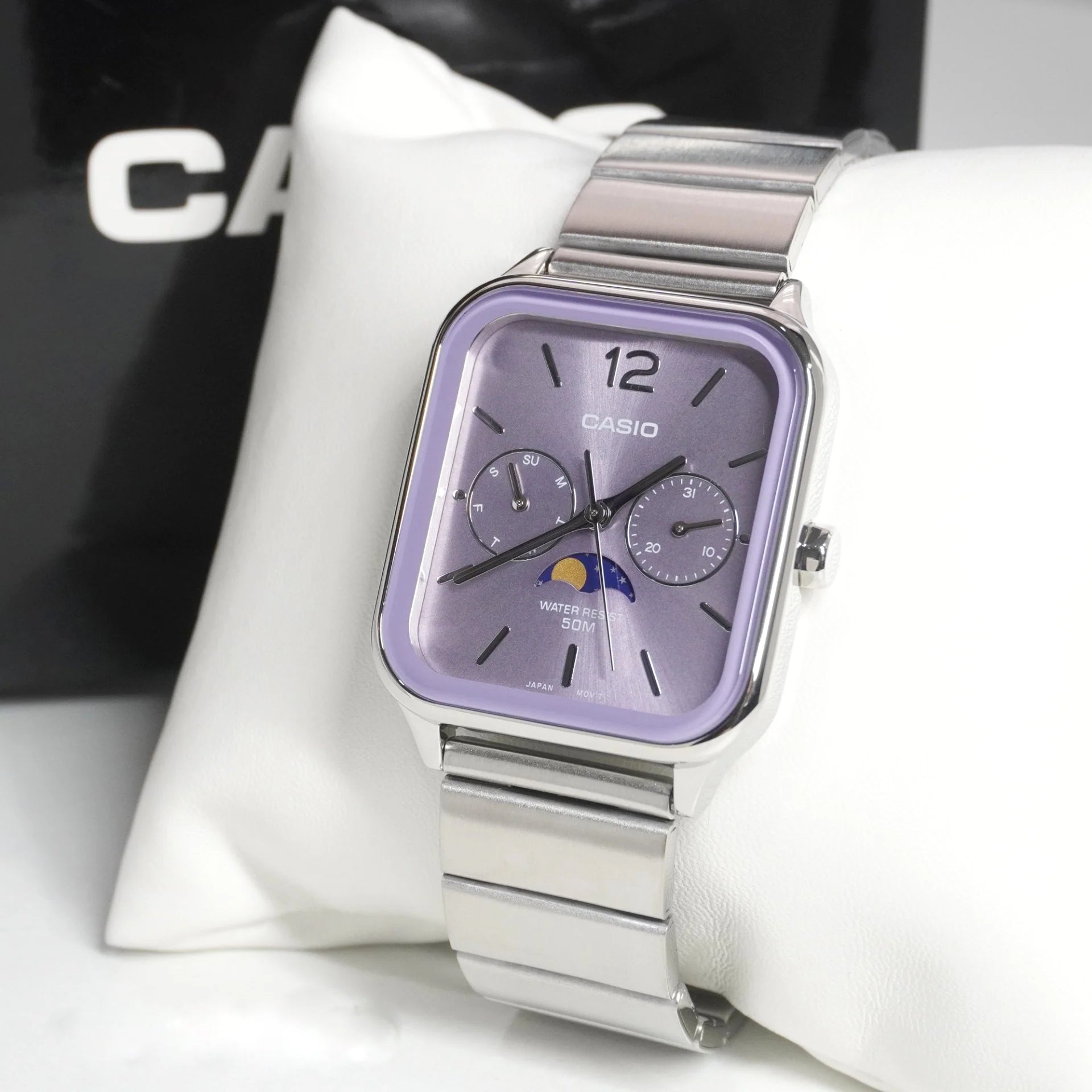 O Casio LTP-M600D-6A é a escolha perfeita para quem busca um acessório que une o charme do design clássico quadrado com um toque contemporâneo. Seu mostrador em tom lavanda (lilás) com acabamento escovado traz uma estética única e delicada, ideal para compor looks tanto casuais quanto formais.